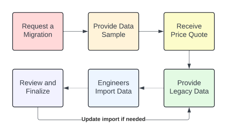 Our engineering team is able to migrate your data from a variety of file formats, from database files, spreadsheets, or CSV files. Most data migrations can be completed within 2-3 weeks.